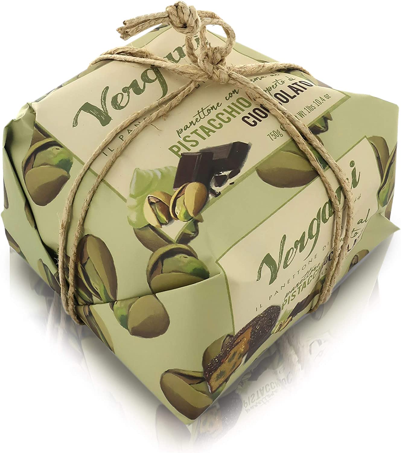 Panettone con crema al pistacchio ricoperto di cioccolato fondente e granelle di pistacchio e di cacao