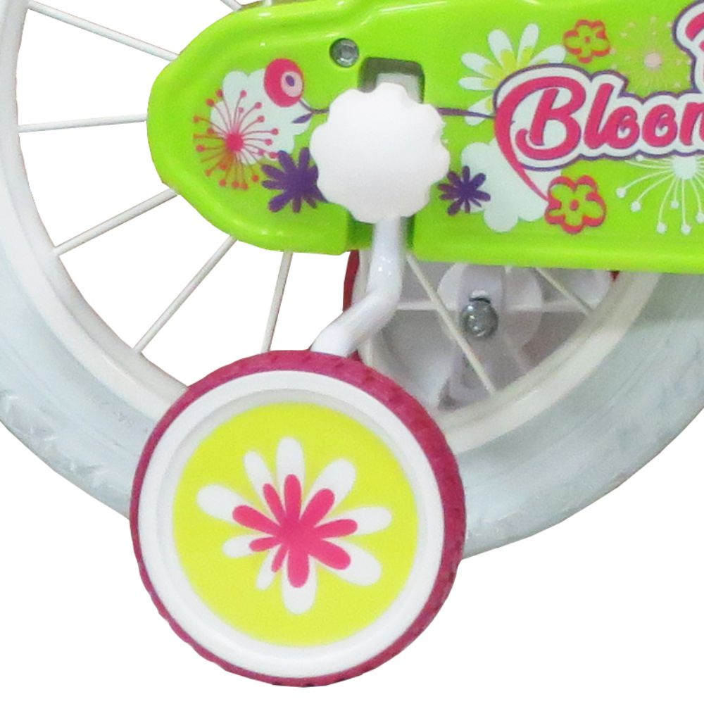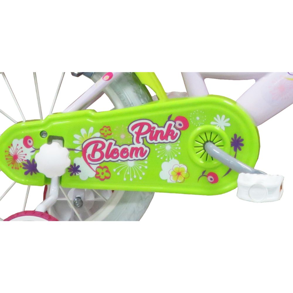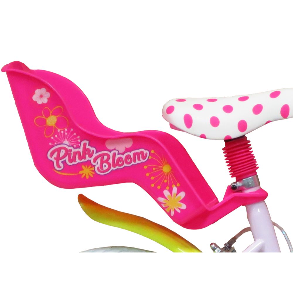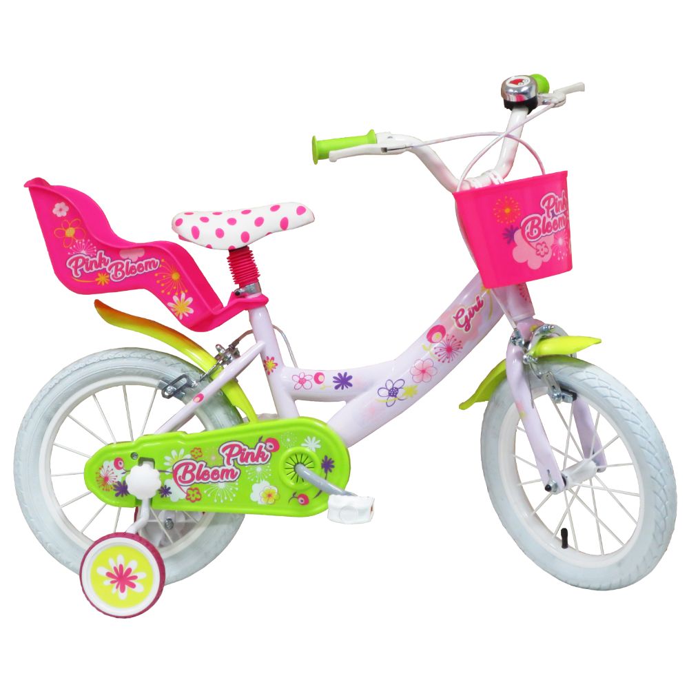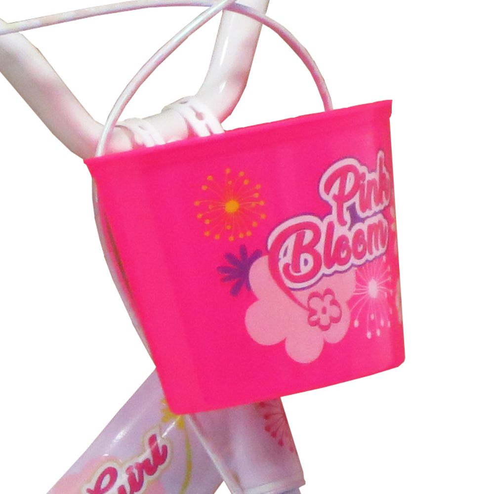 Realizzata completamente in Italia la bicicletta Pink Bloom ha colori brillantissimi e materiali di prima qualità ed è disponibile nelle misure 12, 14 e 16 pollici. Nella 16 pollici il telaio è in acciaio le ruote gonfiabili. I freni sono in acciaio. Ha 2 ruote stabilizzatrici facilmente smontabili ed è fornita con 1 cestino portagoggetti, 1 portabambola posteriore.