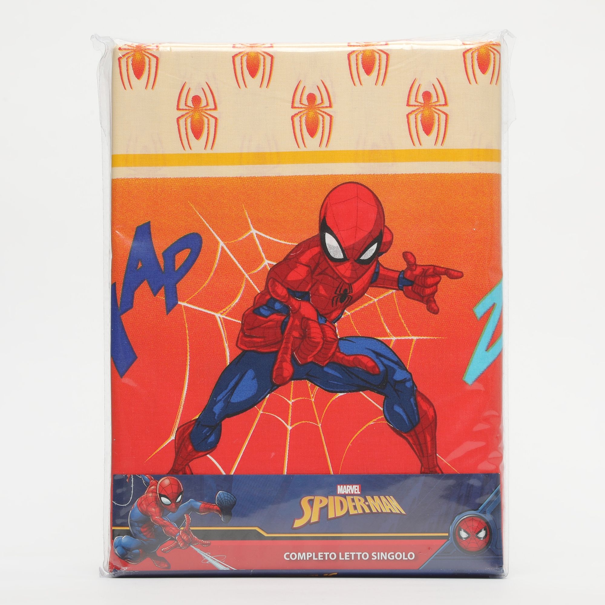 Completo letto realizzato interamente on cotone con il supereroe Spiderman. Cotone anallergico e un prodotto Italiano di qualità per i sonni dei nostri piccoli supereroi.