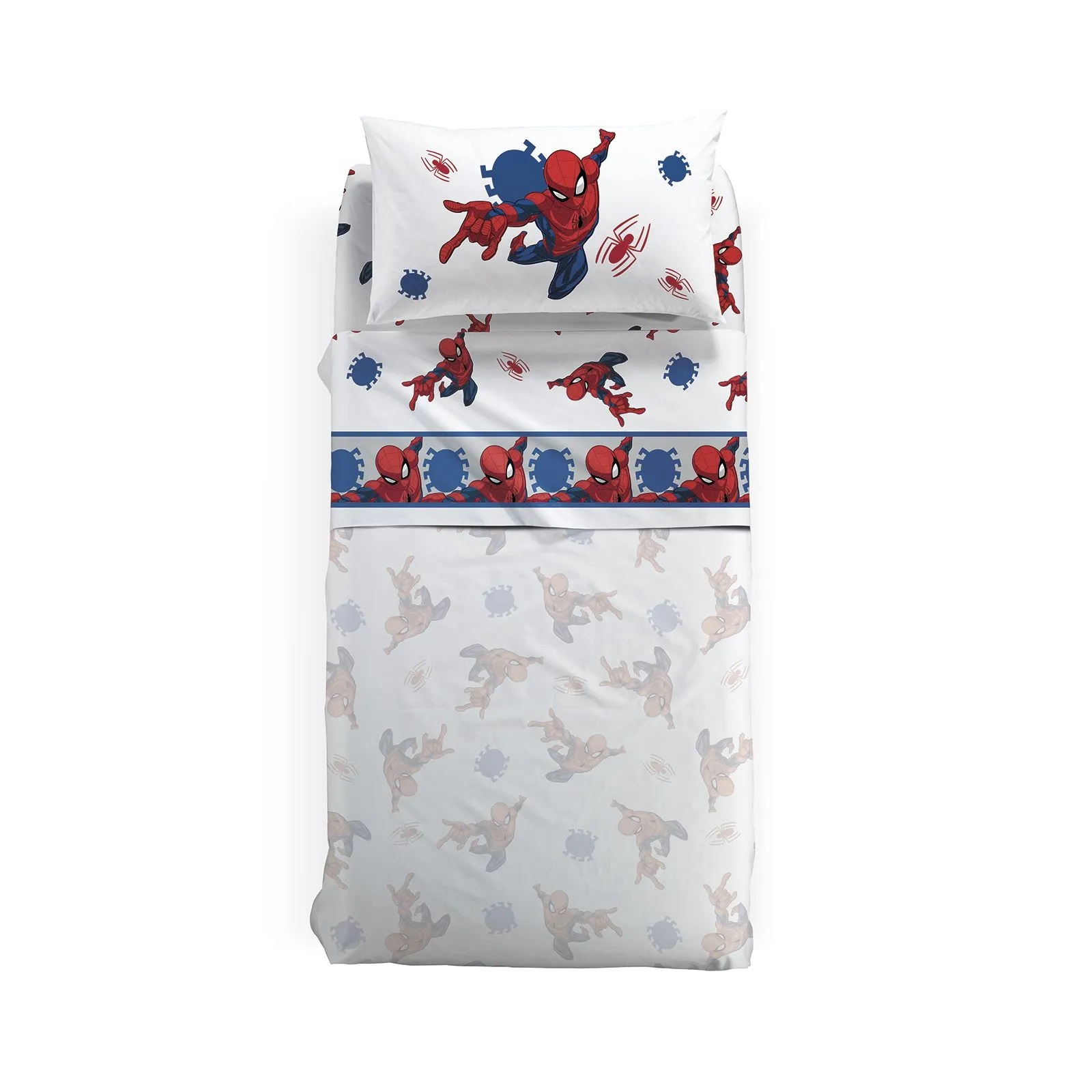 Set lenzuola collezione Spiderman America Caleffi. Protagonista il supereroe Marvel. Set per letto ad 1 piazza composto da lenzuola di sotto con angoli, lenzuolo di sopra e federa.