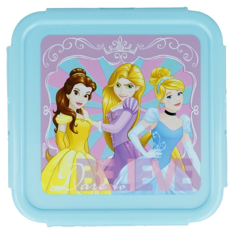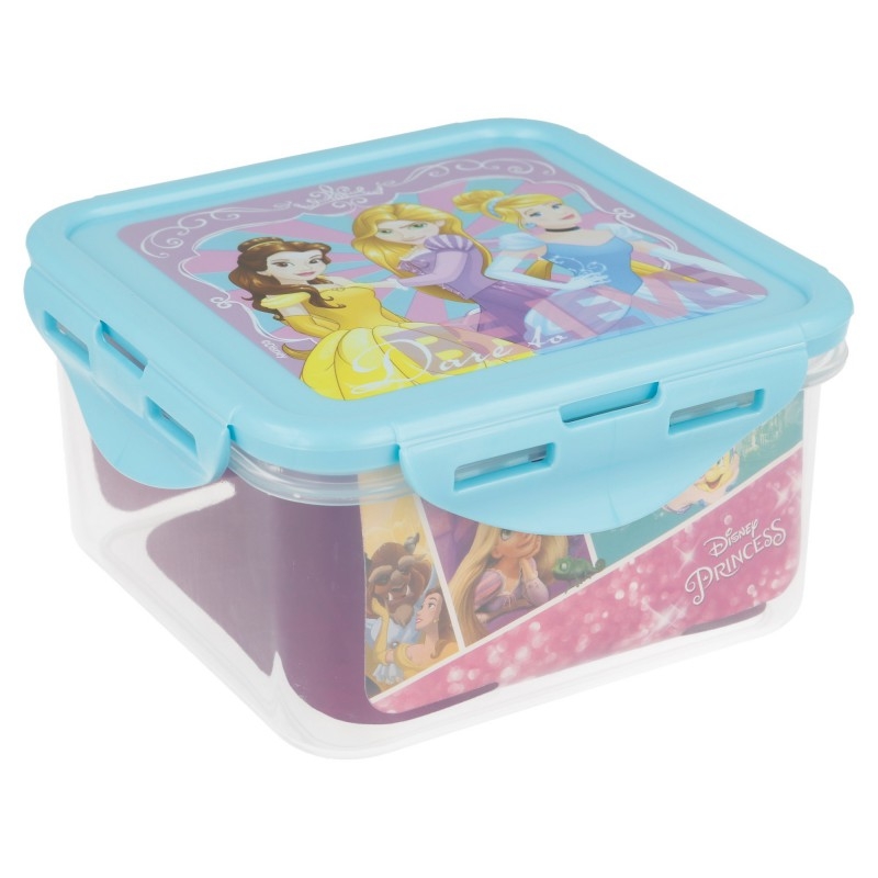 Comodo e pratico contenitore ermetico con le bellissime immagini delle Principesse Disney. Realizzato in plastica trasparente per poter visualizzare con facilità i contenuti ha un coperchio ermetico con sistema di chiusura a 4 punti. Complematente libero da BPA per la massima sicurezza nel conservare e trasportare i cibi delle nostre bimbe.