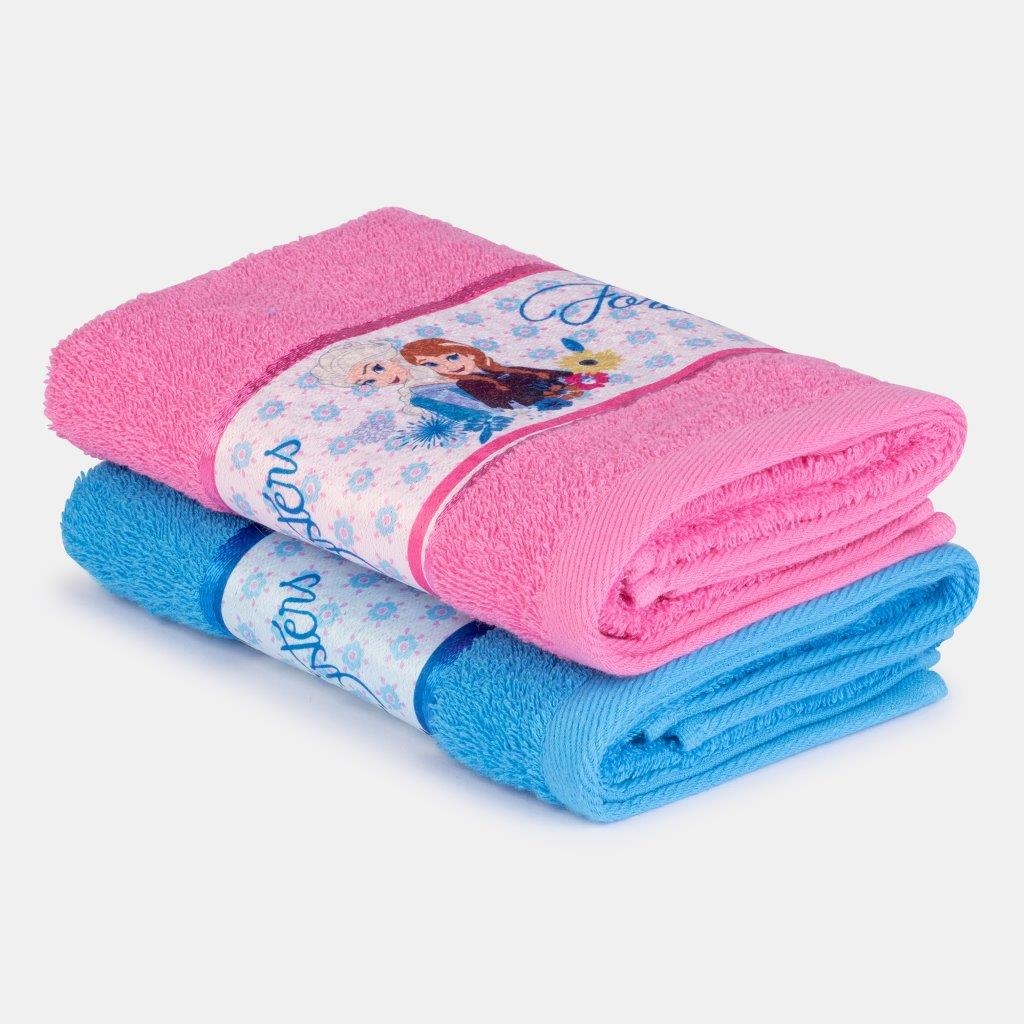 Coppia di asciugamani in spugna di cotone personalizzati con le protagoniste di Frozen. Perfetti per le nostre piccole Principesse.