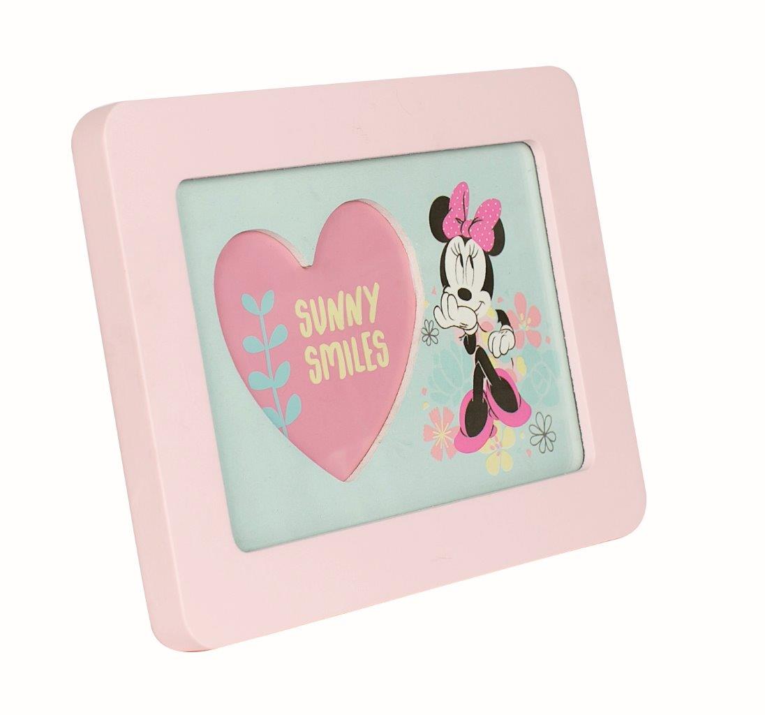 Semplice e allegra questa cornice portafoto di Minnie, per incorniciare i ricordi speciali con sagoma cuore 8x7cm . Con supporto da tavolo.