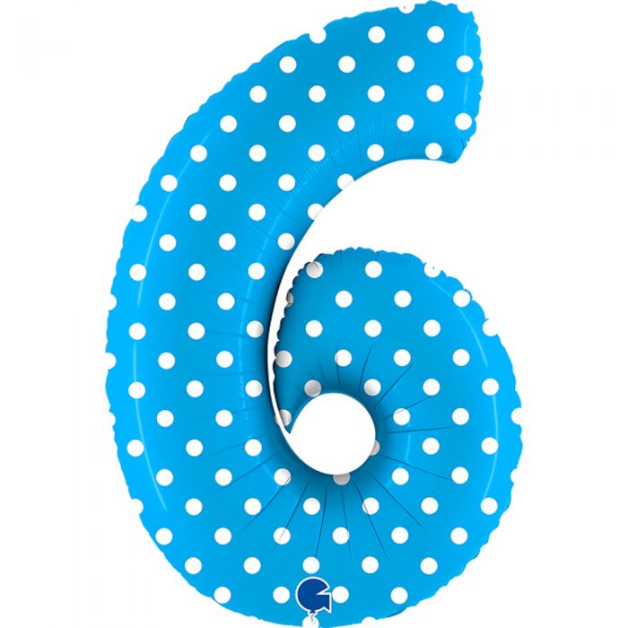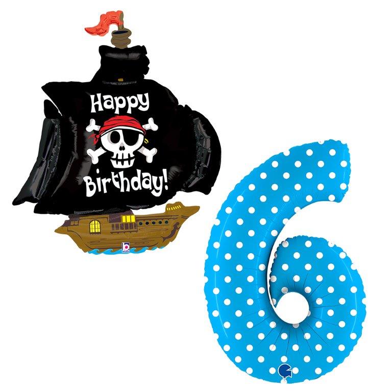 Grabo Set 2 Palloncini Compleanno a Tema Pirati numero 6 azzuro pois e veliero dei pirati con scritta happy birthday. Made in Italy in foil, cannuccia inclusa