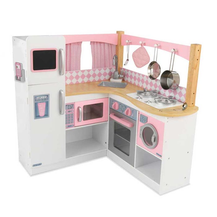 Dimensione: 91,44×90,81×91,76Giocare con la Cucina Grand Gourmet Espresso KidKraft farà sentire ogni bambino come uno chef da stelle Michelin! I bambini possono mettersi subito all’opera con il kit accessori da quattro pezzi in metallo inclusi. Le tendine di stoffa dietro il lavello si aprono per offrire un panorama di fantasia, mentre le manopole girevoli completano l’aspetto realistico. L’innovativo design ad angolo accoglie le numerose caratteristiche fantasiose in uno spazio compatto per ottimizzarne il valore.