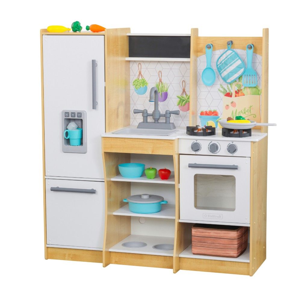 Dimensione: 94.41 x 37.39 x 100.99La Cucina Giocattolo Fresco Raccolto di KidKraft incorpora elementi naturali per stimolare un gioco interattivo che lascia ampio spazio all’immaginazione. La combinazione di legno bianco e legno chiaro striato, unita alla parete di piastrelle geometriche bianche, è una riproduzione esatta delle vere cucine moderne di oggi. La lavagna sopra il lavello aggiunge un tocco di personalità. Scrivi un pensiero, il nome del bambino/a o la lista della spesa. Premi la leva della macchina del ghiaccio per far scendere i cubetti. Gira le manopole del piano cottura e i fuochi prenderanno si accenderanno di luci e suoni. I comodi appendini consentono di appendere gli utensili da cucina e una presina. C’è persino uno spazio per Fido! Nella mensola inferiore, infatti, si trovano due graziose ciotole per cani. Grazie ai cibi e ai piattini già inclusi nella confezione, potrai subito iniziare a preparare dei piatti gustosi. Una volta finito, riponi tutto nel cesto in tela sotto il forno. Nella stanza dei giochi, in camera o al centro della casa, la Cucina Giocattolo Fresco Raccolto aggiunge ore di intrattenimento alla tua routine quotidiana.