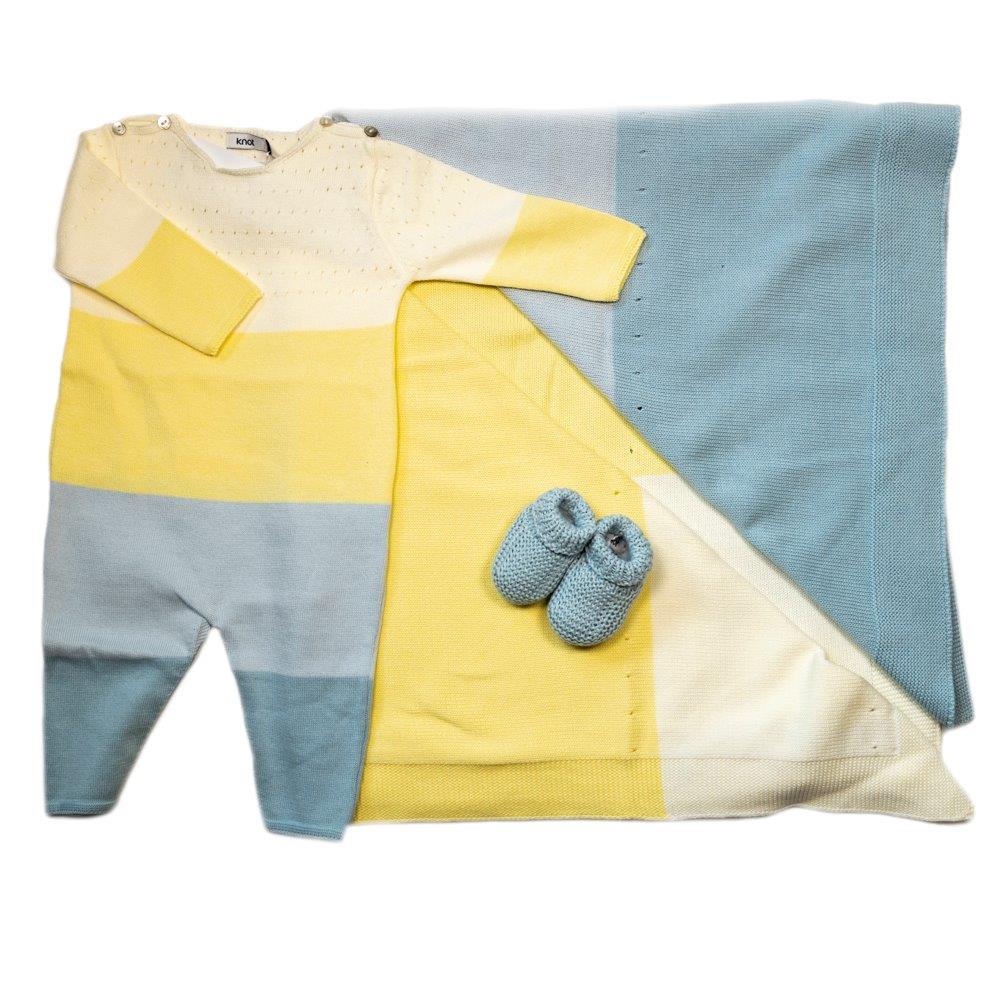 La morbidezza degli articoli che lo compongono è davvero incredibile e i colori delicati sono indicati proprio per i neonati.La tutina, morbida e fresca, è caratterizzata da una piccola lavorazione della parte alta, l’inserimento della testa è facilitata da una apertura che si può estendere grazie a dei bottoncini sulle spalle, questa tutina è senza piedini, e viene proposta insieme alle scarpine azzurre coordinate alla tutina.I filati sono di alta qualità per la quale l’azienda Knot è riconosciuta a livello internazionale.La copertina misura 90x95cm