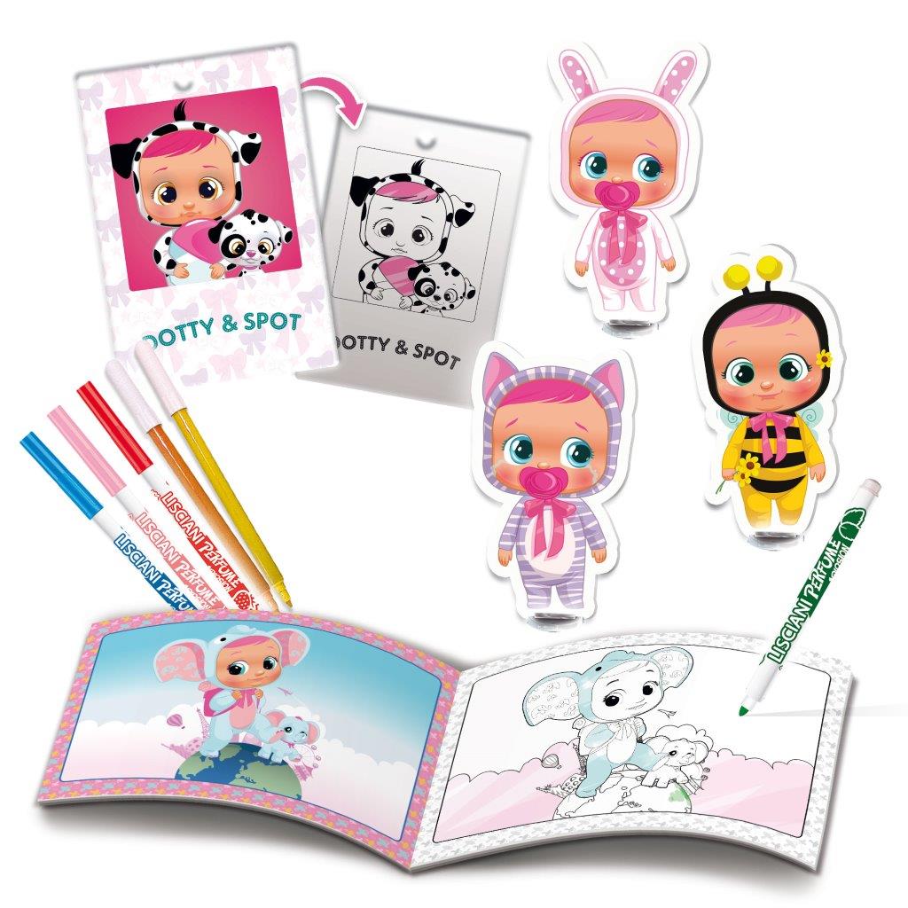 Divertiti a giocare con tantissime immagini del mondo delle Cry Babies, con il profumtissimo kit di pennarelli! All’interno della scatola troverai un quadretto double-face da colorare e appendere, 3 personaggi sagomati con card stand da colorare, 6 pennarelli profumati e una guida operativa con tante immagini da colorare.