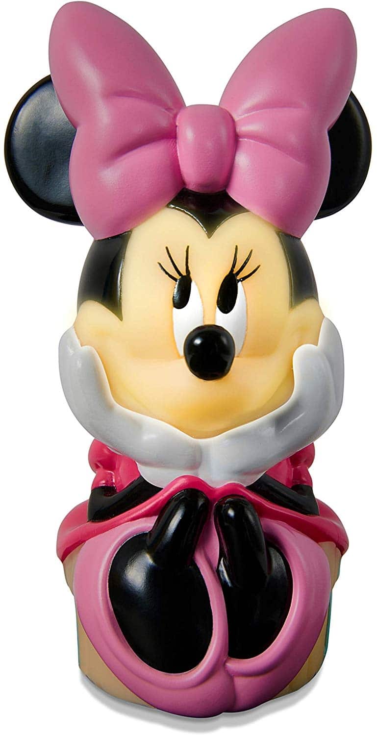 Una bellissima lampada tridimensionale con 2 funzioni Luce per la notte e torcia. Minnie si può accendere sulla base fissa e rimane come luce di compagnia con uno spegnimento programmato a 10 minuti oppure si può sollevare e funziona come torcia per essere utilizzata dal bambino mentre gioca ed esplora il suo mondo. La sagoma di Minnie è morbidissima e grazie al fatto che funziona con lampade LED è a luce fredda è sicura e può essere maneggiata senza alcun problema dal bambino.