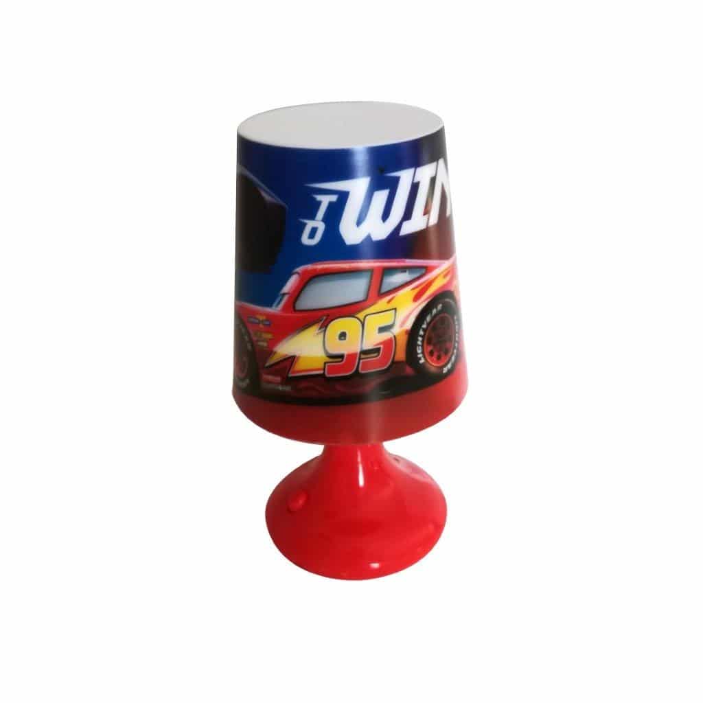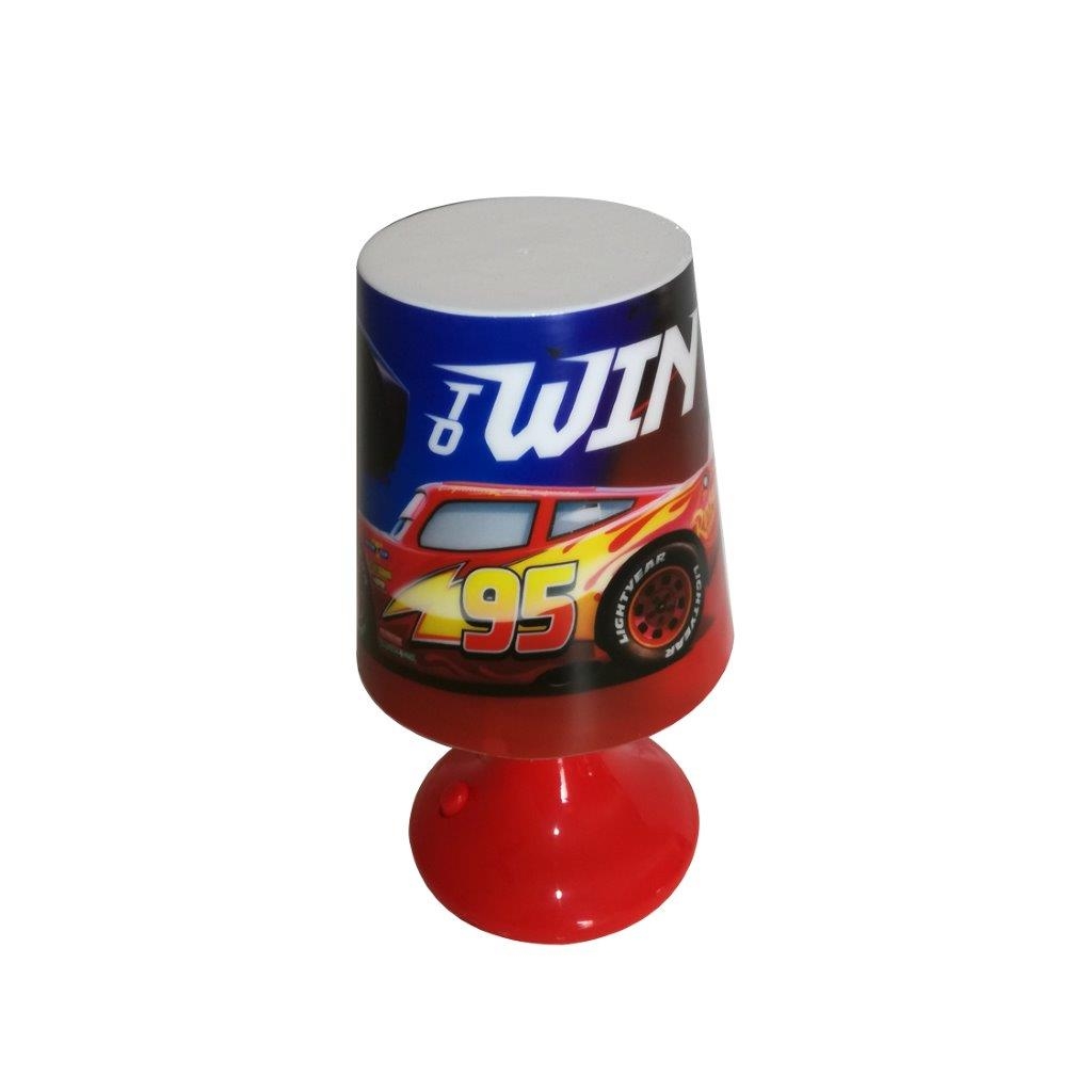 Una lampada da comodino di dimensioni ridotte per illuminare con simpatia e calore la camera dei nostri bambini. Questa lampada con protagonista Saetta Mc Queen direttamente da Disney Cars, è realizzata in polipropilene in modo da ridurre al massimo i danneggiamenti in caso di cadute accidentali ed ha inclusa la luce led. Funziona con 3 batterie AA da 1,5 V. Funziona con pulsante On/Off alla base della lampada. In polipropilene lampadina LED inclusa