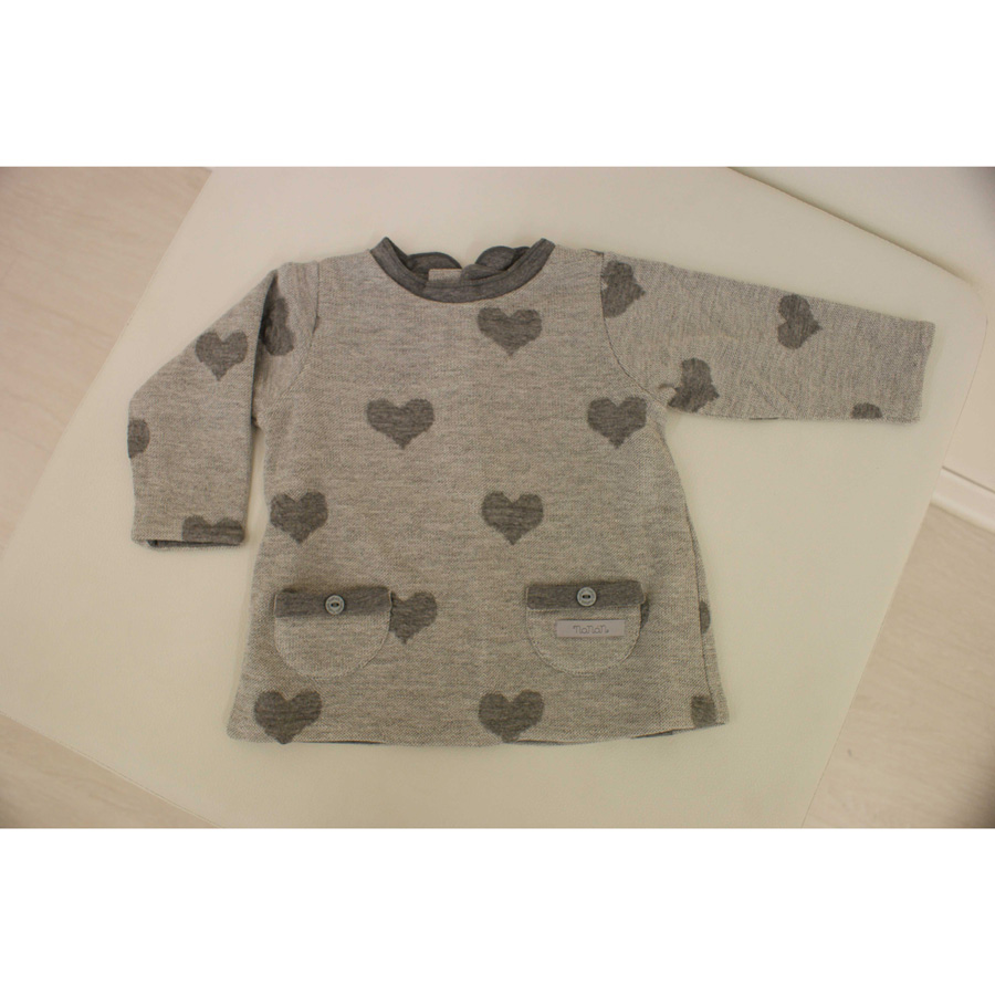 Abito per bambina in cotone con decorazione cuoricini. Disponibile per bambine di età tra i 3 e i 18 mesi.
