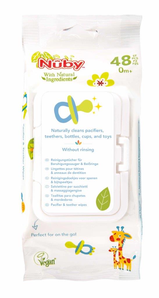 Le salviettine Nuby per succhietti e massaggiagengive sono realizzate con ingredienti naturali e Citroganix. Puliscono succhietti e massaggiagengive senza bisogno di risciacquare, ideali pertanto fuori casa.