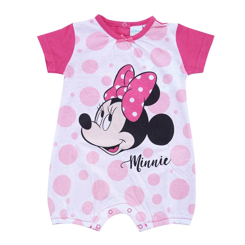 Pagliaccetto tutina estiva per neonati di Minnie, realizzata in cotone con bottoni per facilitare la vestizione della bambina Disponibile in 2 colori rosso e Fuxia nelle taglie da 1 a 9 mesi.