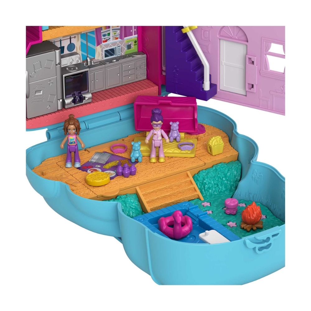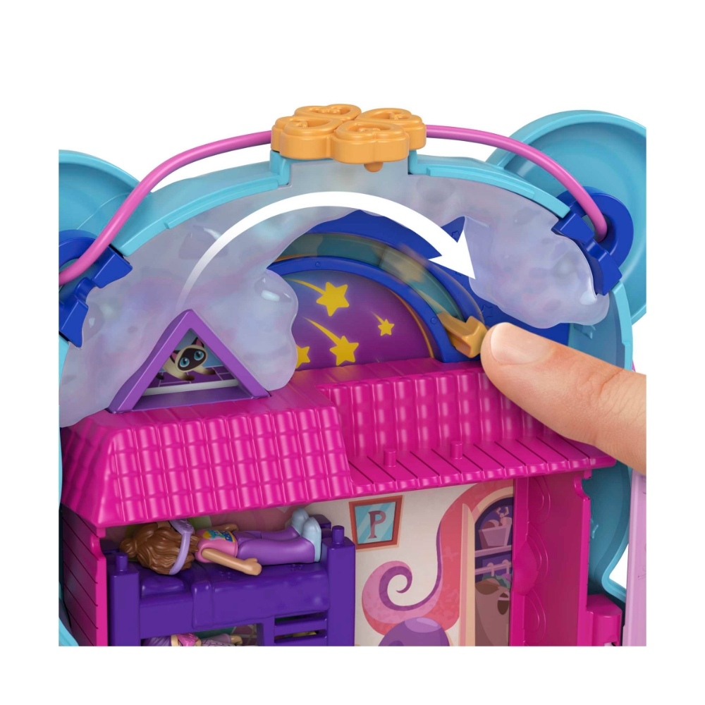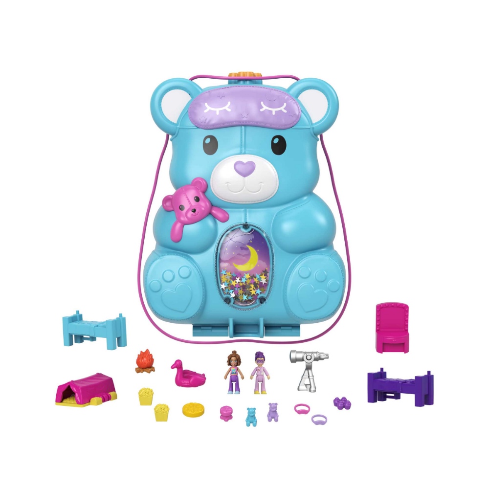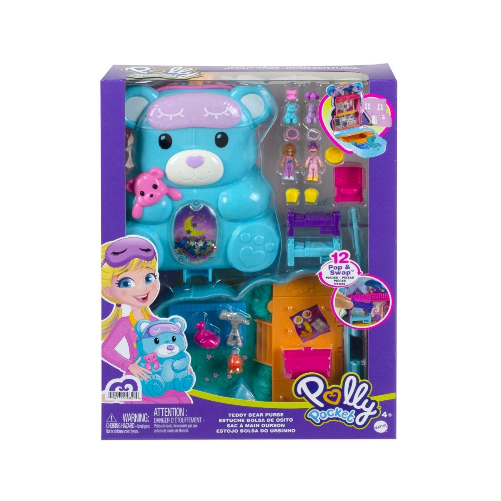 Partecipa a un pigiama party con le tue amiche del cuore insieme a Polly Pocket! Perfetto per giocare a casa o dove vuoi, questo cofanetto-borsetta a forma di orsacchiotto ha dimensioni più grandi e all’esterno sfoggia un pancino con glitter da scuotere. Apri il cofanetto e rivela un’entusiasmante avventura a tema pigiama party, con 16 accessori (alcuni con funzione Attacca e Stacca) e 2 micro bambole. Scopri e inventa tante storie allegre: apri la parte frontale della casa o la porta d’ingresso, aggancia una bambola sulla scala e falla scorrere su e giù, muovi la stella sul cielo per rivelare le stelle cadenti, apri il forno e il frigorifero per inserire i pezzi gioco all’interno, aggancia gli accessori sulla terrazza e l’area piscina, crea un letto a castello sovrapponendo i pezzi, apri la tenda e inserisci una bambola all’interno. E quando hai finito, riponi tutti i pezzi gioco nella terrazza che si apre e chiude. Aggancia i pezzi nei diversi punti del cofanetto per un numero infinito di possibilità di gioco! Il cofanetto ha una tracolla regolabile. Colori e decorazioni possono variare. Un regalo fantastico per i bambini dai 4 anni in su. 4+ Anni