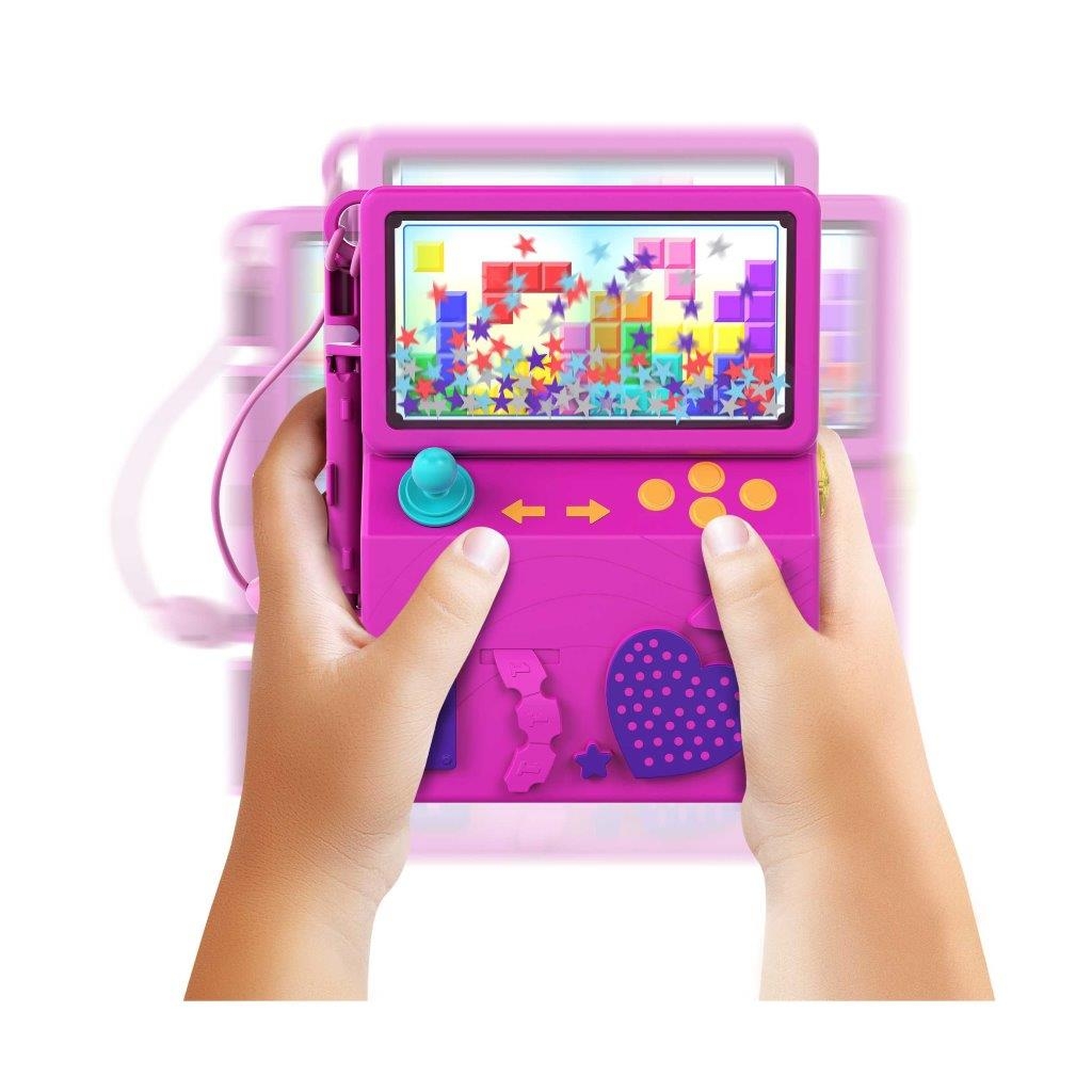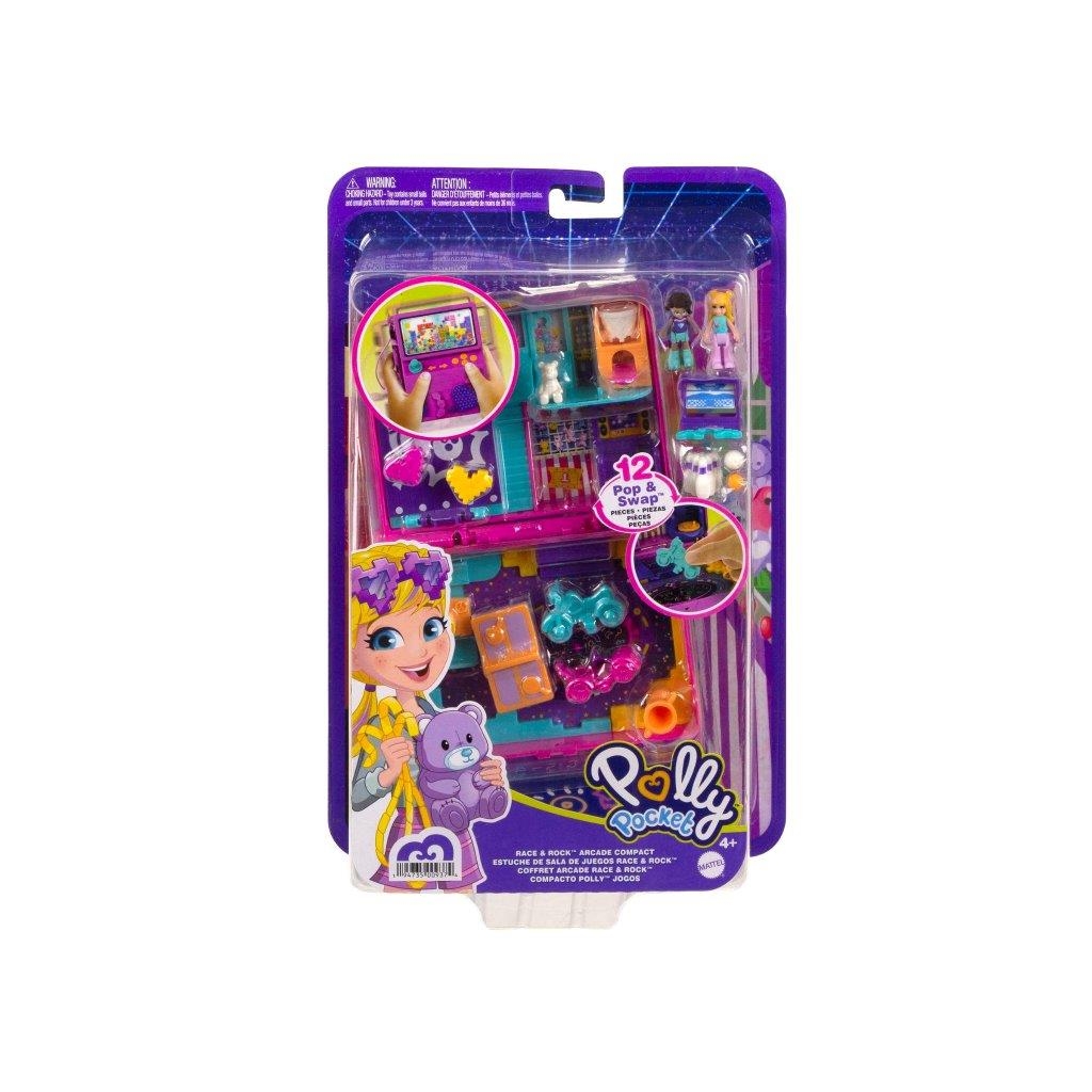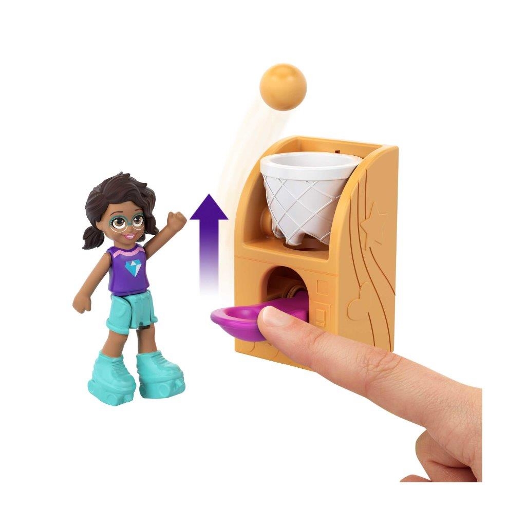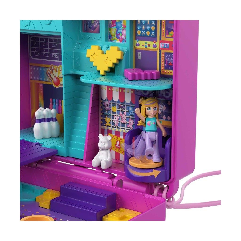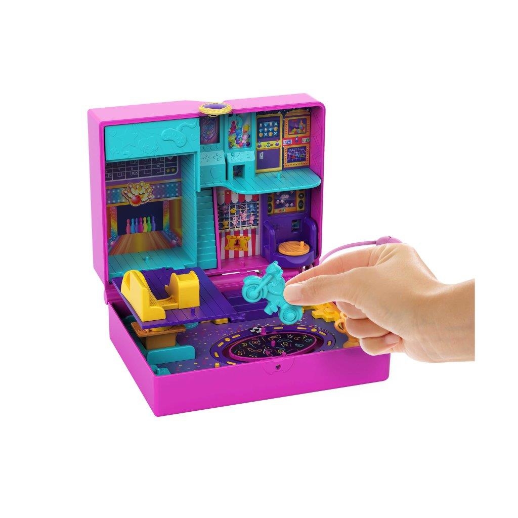 Preparati a divertirti con i videogiochi insieme a Polly Pocket! Perfetto per giocare a casa o dove vuoi, il cofanetto Salagiochi si ispira a un arcade ed è dotato di una finestrella esterna con glitter da scuotere. Apri il cofanetto e rivela un’avventura entusiasmante in una sala videogiochi con 5 simpatiche funzionalità a sorpresa, 12 accessori (alcuni con funzione Attacca e Stacca), oltre alle micro bambole Polly e Shani. Scopri e inventa tante storie allegre: inserisci una delle bambole nel gioco dance per farla ballare, abbassa la pista da bowling per fare strike, posiziona il go-kart e la moto sulla pista da corsa per gareggiare, fai canestro con il gioco del basket e cambia lo schermo della TV con 3 giochi diversi. Aggancia i pezzi nei diversi punti del cofanetto per un numero infinito di possibilità di gioco! Il cofanetto è anche dotato di un cinturino da polso, così potrai portarlo sempre con te e ricreare divertenti avventure insieme a Polly Pocket dove vuoi e quando vuoi! Colori e decorazioni possono variare. Un regalo fantastico per i bambini dai 4 anni in su