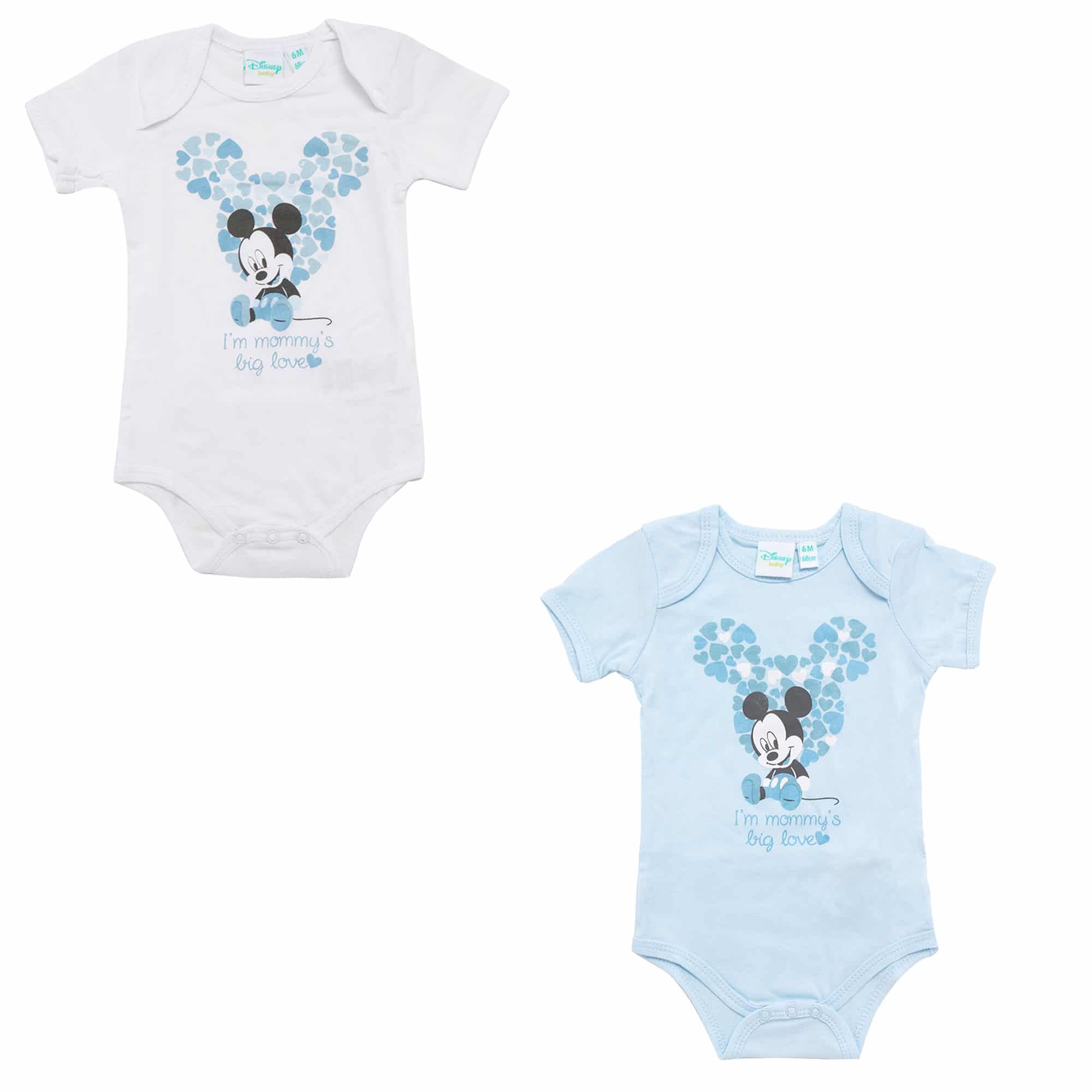 Set 2 body estivi Mickey Mouse. Chusura con bottoni disponibile nelle taglie da 1 mese a 3 mesi assortito in 2 colori bianco e azzurro.