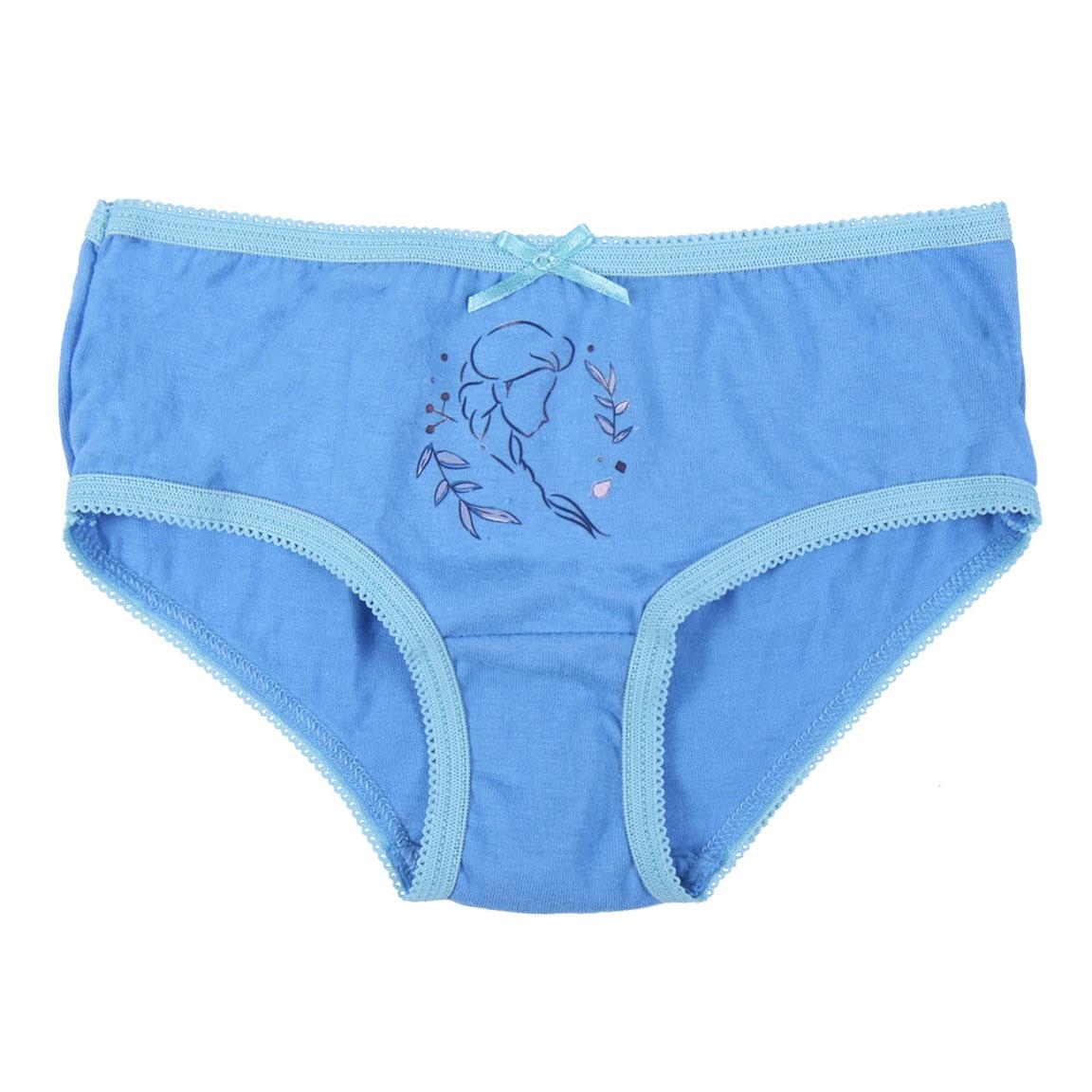 Scatola contenente 5 slip Disney Frozen. 5 fantasie diverse realizzate intermante in cotone da 150 grammi al metro quadro. Disponibili nelle taglie dalla 2 alla 6 anni