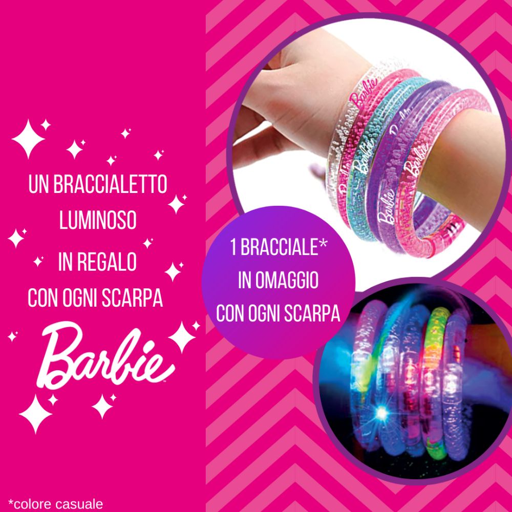 Sono arrivate le scarpe Barbie! Scopri il modello più di tendenza della stagione. Vivaci e coloratissime, renderanno i tuoi look irresistibili! La comodissima suola platform personalizzata è il dettaglio più glam! Disponibili in due varianti colore, nelle taglie da 28 a 35. Sempre in regalo con l’acquisto delle scarpe Barbie, un fantastico braccialetto luminoso!