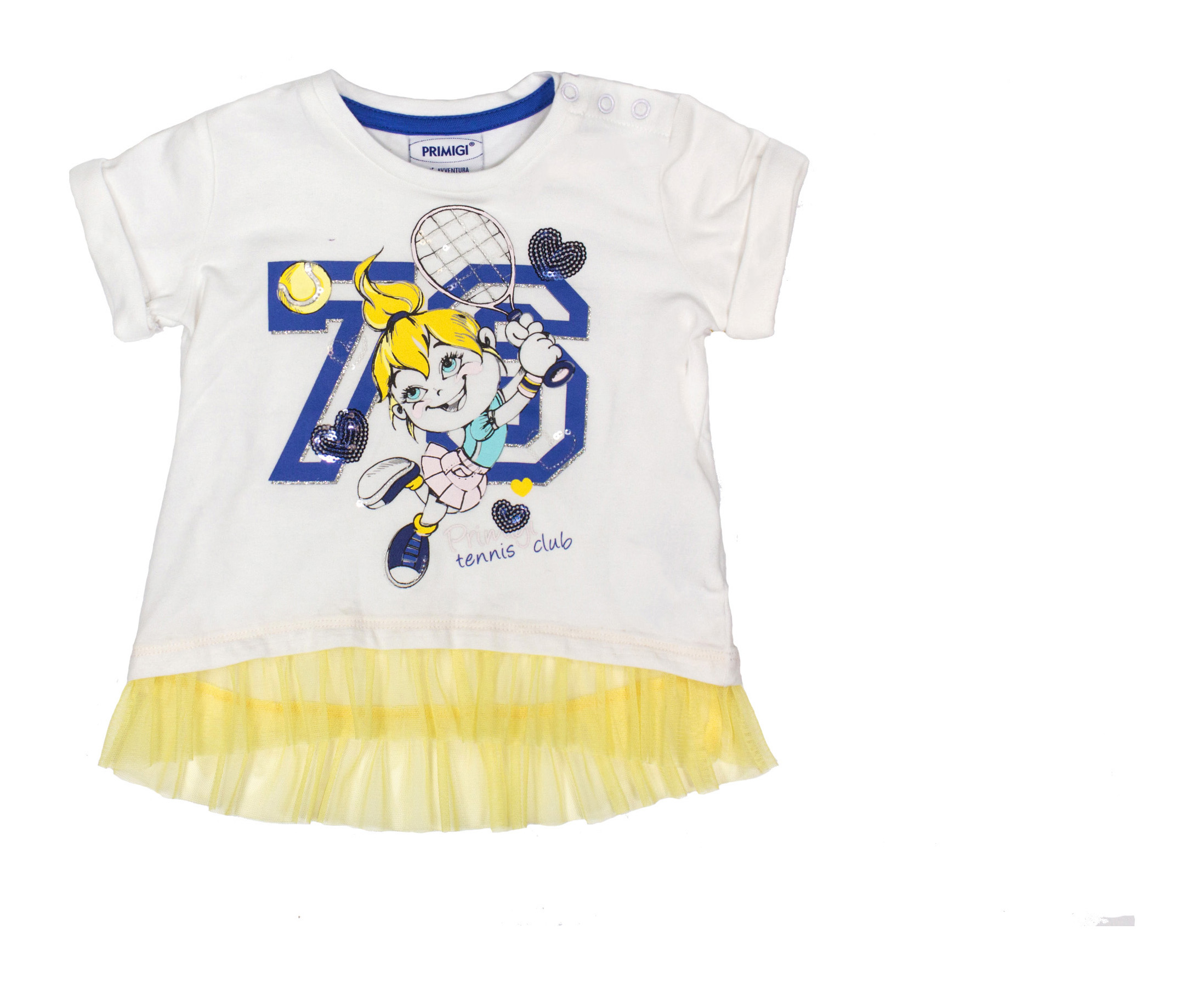 Super trendy sia la stampa decorata da luminose paillette sia il leggero voila in tulle giallo.