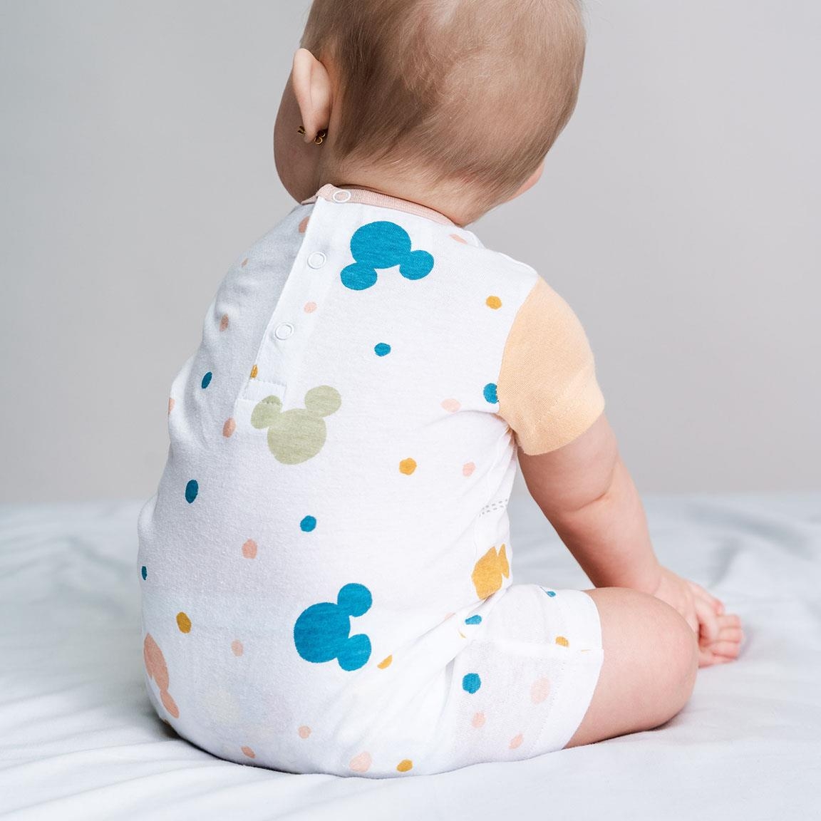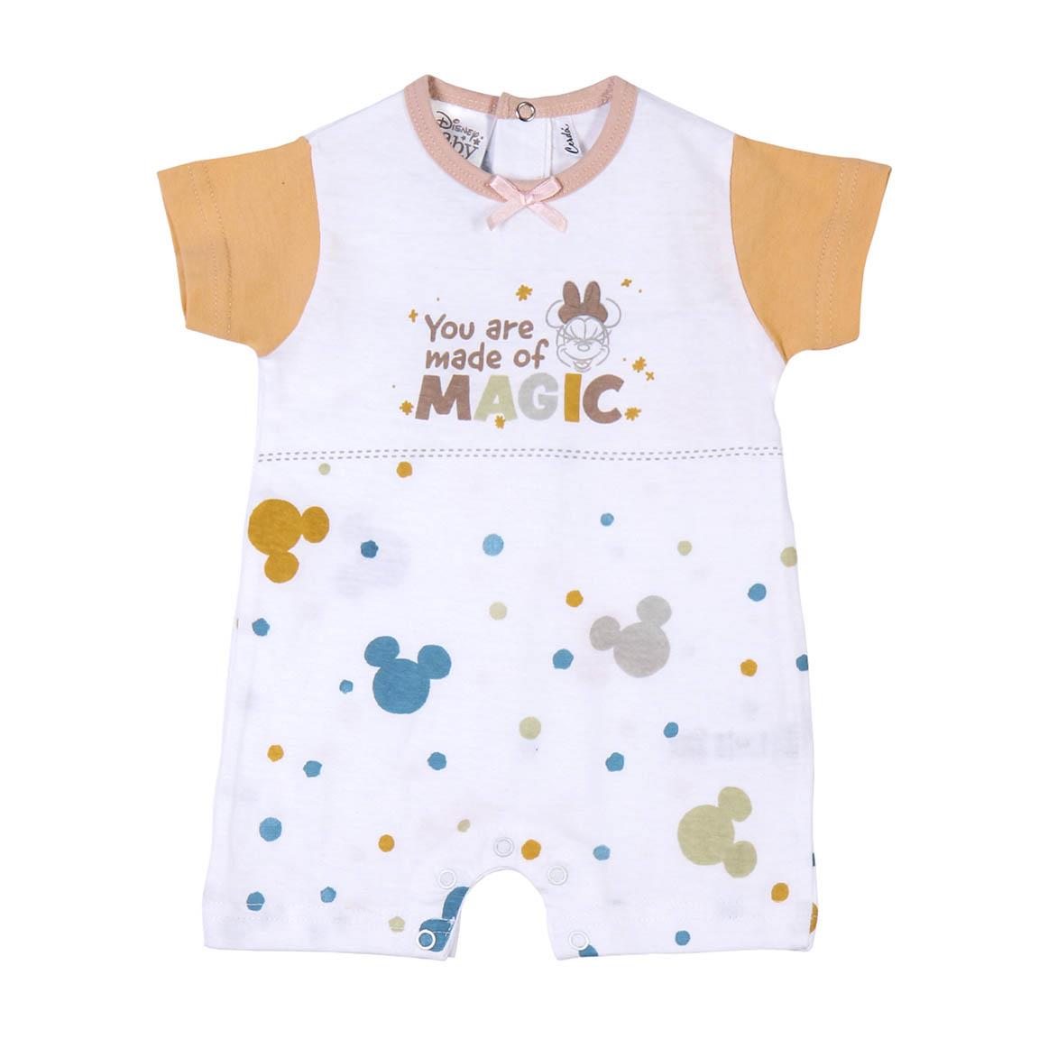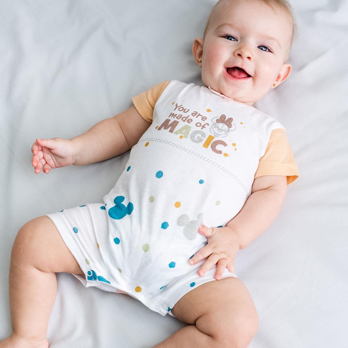 Tutina estiva per neonati. In licenza ufficiale Disney con stampa allover dei dolcissimi personaggi Disney Baby. Disponibile nelle taglie da 1 mese a 9 mei. Istruzioni di lavaggio: lavare a massimo 30 gradi, non utilizzare sbiancanti, non mettere in asciugatrice, stirare a bassa temperatura max 110 gradi, non lavare a secco. composizione 100% cotone da 160 grammi al metro quadro